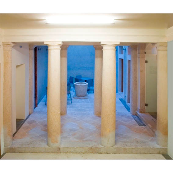 Prijamni prostor Galerije smješten je u atriju zgrade koji je stupovima povezan s natkrivenim unutarnjim dvorištem.